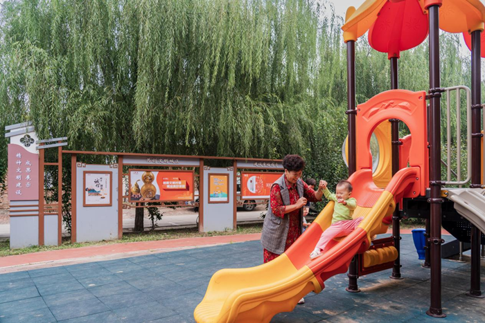 9月26日,在天津市西青区杨柳青镇白滩寺村文化广场,小朋友正在玩滑梯。新华网 钟奕 摄