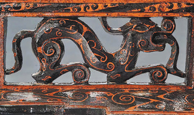 新型器皿不断涌现,成为这个时期漆器品类变化的一大特点。其中,武王墩墓出土的酒具盒最具代表性,其常见于大型楚墓中。此器是盛放耳杯等酒具的盒子,底部雕有倨伏四足。据《山海经》记载,这种双头动物是传说中的神兽“并封”。湖北天星观二号墓酒具盒纹饰内容很丰富,宴乐、狩猎等生活场景均有所展现,成为中国年代最早的连环画之一。从这些漆器我们可以看到,楚国贵胄生前使用的漆木器等生活用具制作精巧,寓意丰富。