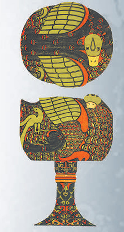 湖北江陵楚墓出土的彩绘鸳鸯纹木雕漆豆复原图。聂菲供图