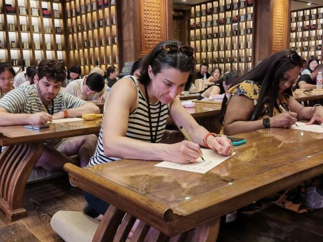 “子曰:德不孤,必有邻。”在尼山圣境大学堂,美国青年用毛笔在字帖上临摹这句孔子语录。“我觉得写毛笔字是一件能让心灵安静下来的事情。它让我注意力集中,只专注于写字这一件事,思考下笔时用多大的力度、每一道笔画该怎么写,把其他一切都抛到一边。我很享受这个过程。”来自佐治亚理工学院的研究生卡洛斯·伊拉赫塔说。