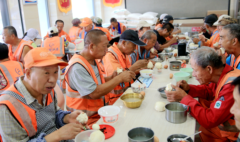 8月28日,环卫工人们正在志愿沧州爱心服务站吃爱心早餐。新华网 吕翔 摄
