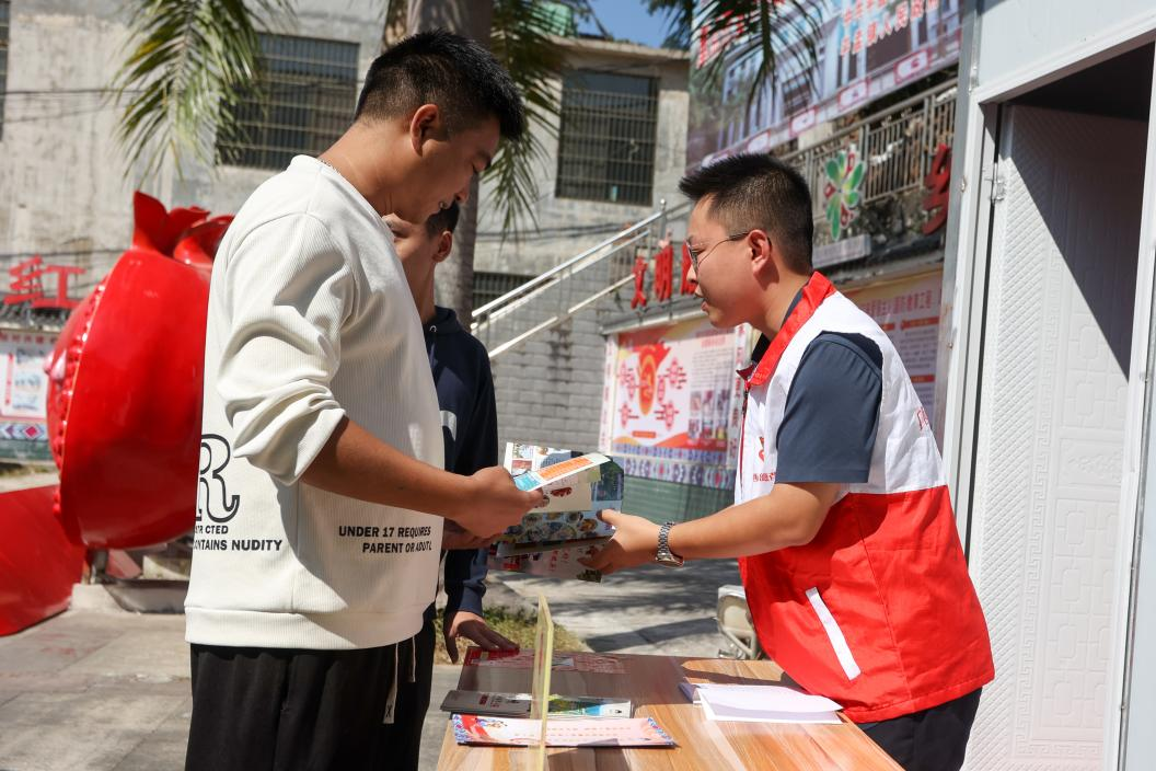 资料图:志愿者在“国门书吧”前为群众发放宣传资料。新华网发(百色市融媒体中心 梁力升 摄)